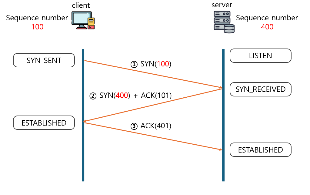 이때 클라이언트는 SYN_SENT 단계가 되며 SYN에 대한 응답인 ACK를 기다리는 상태가 됩니다. - 서버는 리슨 상태에서 시퀀스 넘버를 받고 자신의 시퀀스 넘버 (400)와