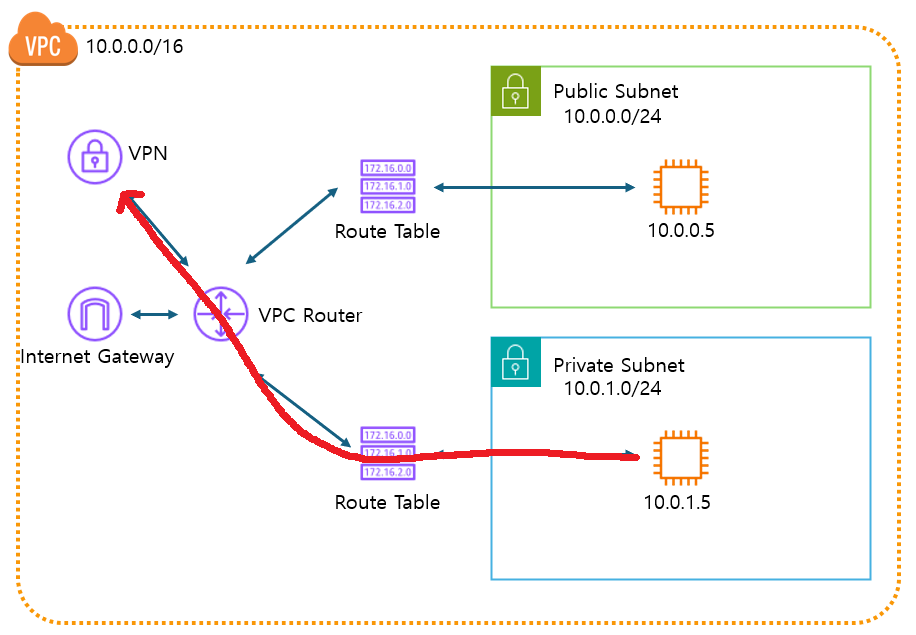 route table을 확인하고 VPN으로 데이터를 전달합니다.