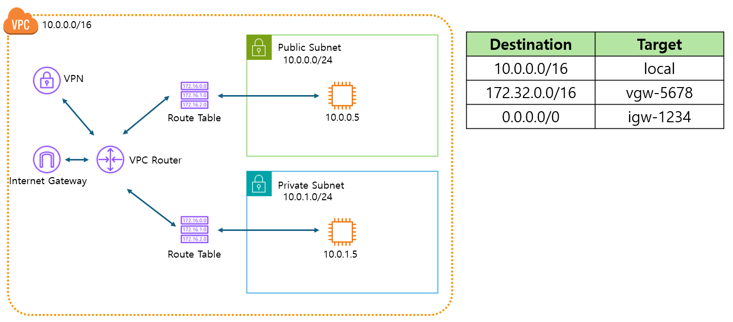 - 특정 트래픽이 VPC Router를 타고 어디로 가야 하는지 알려줌
