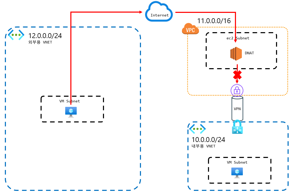설명을 간단히 드리자면 외부용 VNET의 VM에서 EC2로 인터넷을 통해 통신을 하면 EC2에서 DNAT / SNAT를 하여 내부 VM에 전달되는 아키텍쳐입니다.