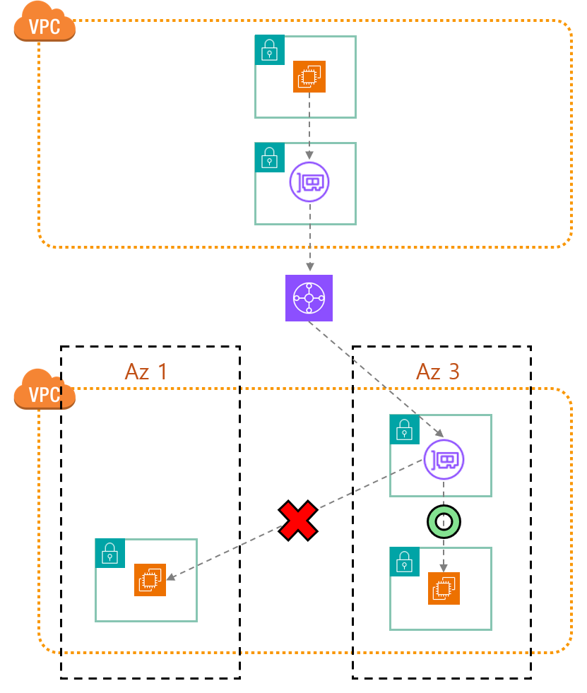 만약 통신하고자 하는 리소스가 c 가용영역에 있고 transit gateway는 a 가용영역에 있을 경우 통신이 불가능합니다.
