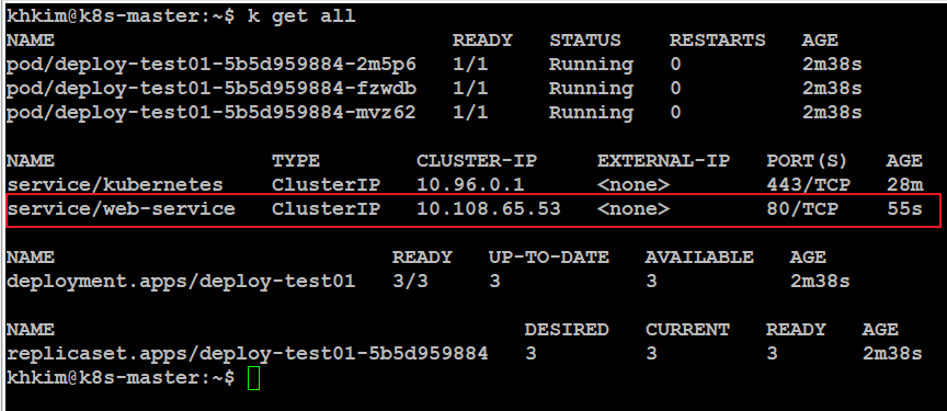 앞서 말씀드렸듯이 ClusterIP의 경우 외부에서는 접근이 불가능하기 때문에 테스트용 파드를 하나 더 올려주겠습니다.