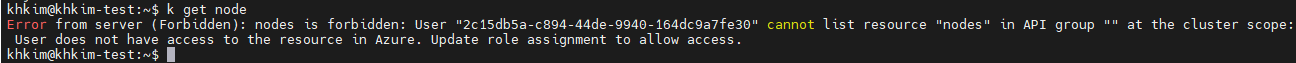 오류에서도 알 수 있듯이 이번에는 Entra ID에는 접근이 되나 그냥 AKS에 붙을 권한이 없는 것입니다.