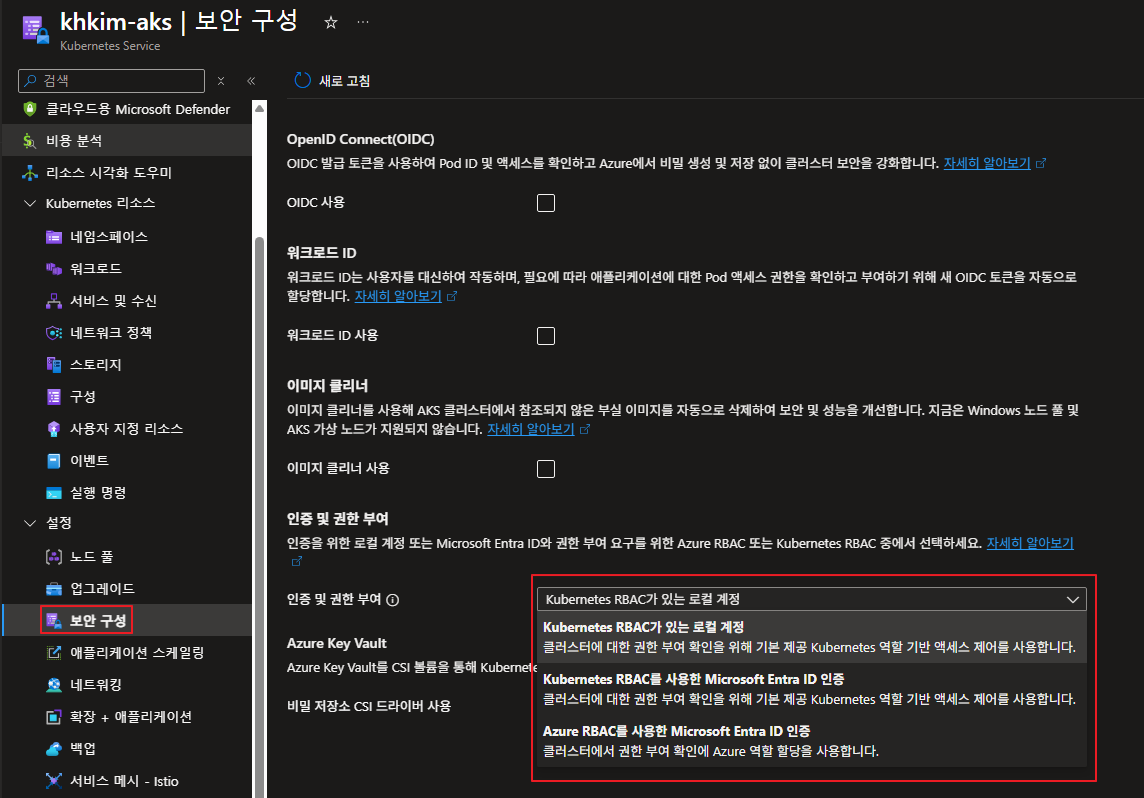 참고로 "Kubernetes RBAC가 있는 로컬 계정" 해당 인증에서 다른 인증으로 변경하면 원래대로 못 돌아가니 주의해야합니다.