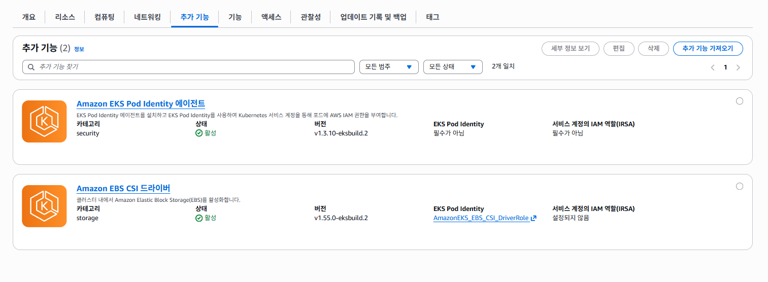 "Amazon EBS CSI 드라이버"와 "Amazon EKS Pod Identity 에이전트"를 클릭 후 설치합니다.