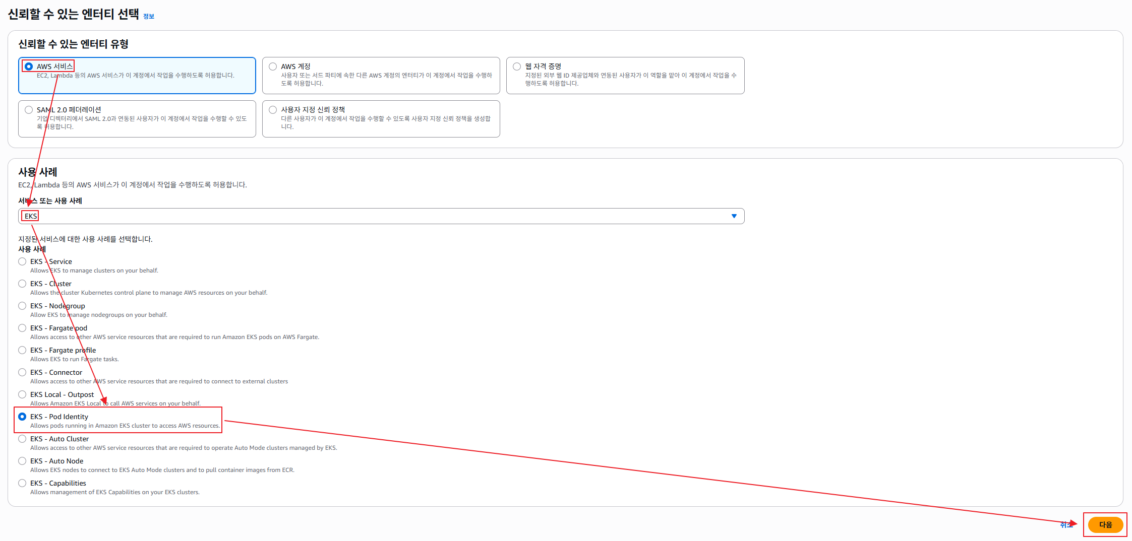 신뢰할 수 있는 엔터티로 EKS의 EKS - Pod Identity를 선택합니다.