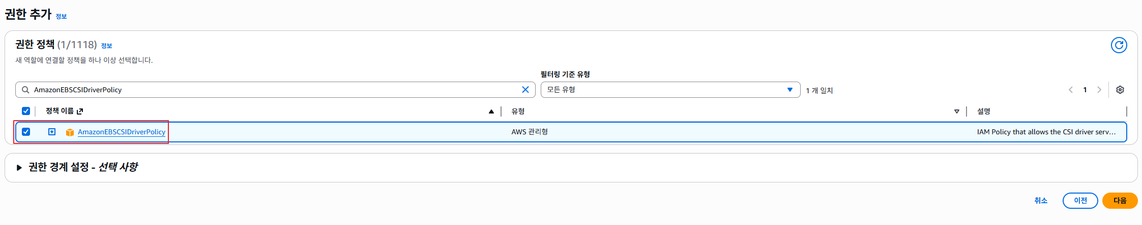 "AmazonEBSCSIDriverPolicy" 정책을 할당합니다.
